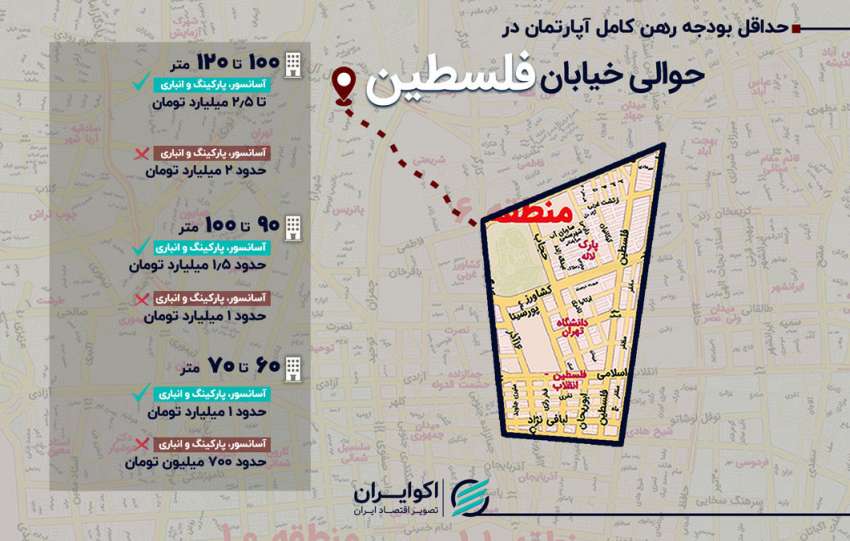 بررسی بازار مسکن در محدوده خیابان فلسطین نشان می‌دهد که برای رهن کامل یک آپارتمان ۶۰ تا ۷۰ متری بدون امکانات، حداقل ۷۰۰ میلیون تومان و برای واحدهای نوساز و دارای امکانات کامل تا ۲ میلیارد و ۵۰۰ میلیون تومان بودجه نیاز است.