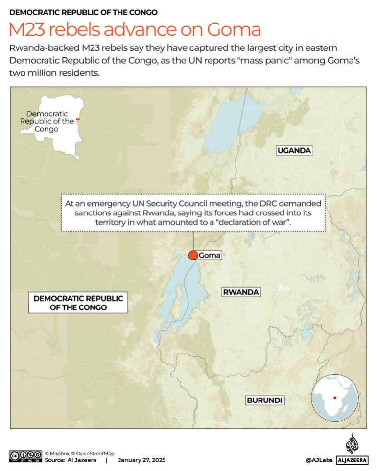 «پاتریک مویایا» سخنگوی دولت کنگو با انتشار پیامی در شبکه اجتماعی «ایکس» حضور نیروهای ارتش رواندا در شهر گوما را تأیید کرد. وی به ساکنان این شهر توصیه کرد که در منازل خود بمانند و از غارت اموال عمومی خودداری کنند. سخنگوی دولت کنگو در ادامه گفت: دولت همچنان تلاش می‌کند که از قتل‌عام و کشتار خودداری کند، چیزی که از اهداف اصلی رواندا است.»