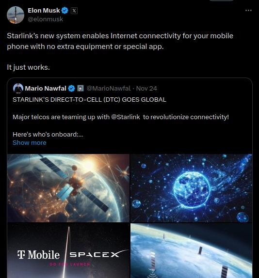 او درباره این سرویس نوظهور نوشت: «سیستم جدید استارلینک امکان اتصال به اینترنت را برای تلفن همراه شما فراهم می‌کند، بدون نیاز به تجهیزات اضافی یا اپلیکیشن خاص.»